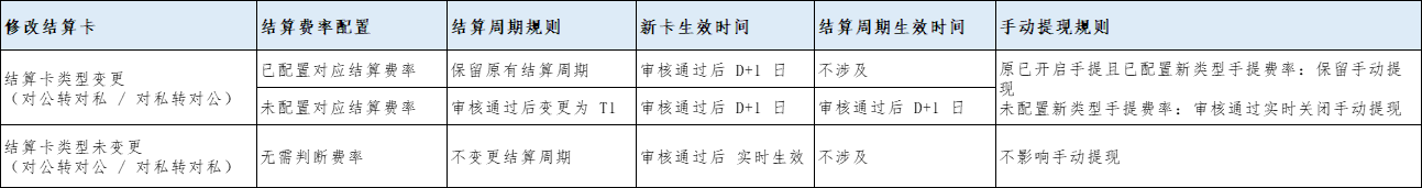 2.2.6商户申请单结果查询API结算卡变更生效时间和结算周期与变更类型有关,规则参考下图: